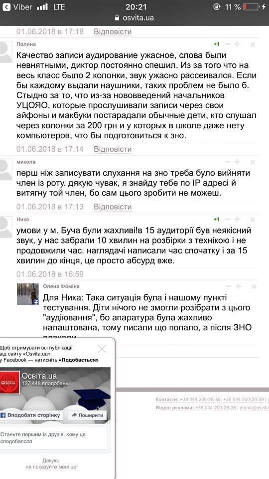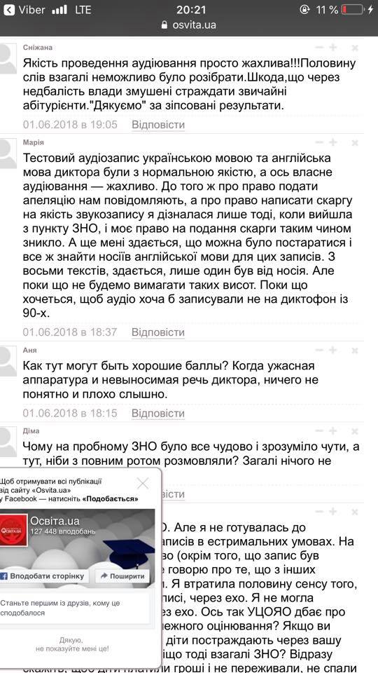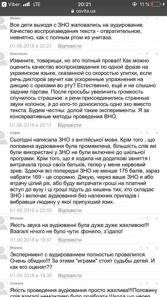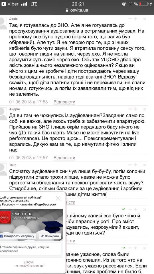 "Вкотре обманули наших дітей!!! Якість аудіювання не дала змоги нормально виконувати інші завдання!!! Діти просто завалили весь тест! Це ганьба!!! Хто буде відповідати за долю дітей?!", - поддерживает ее Юлия Шевченко.
