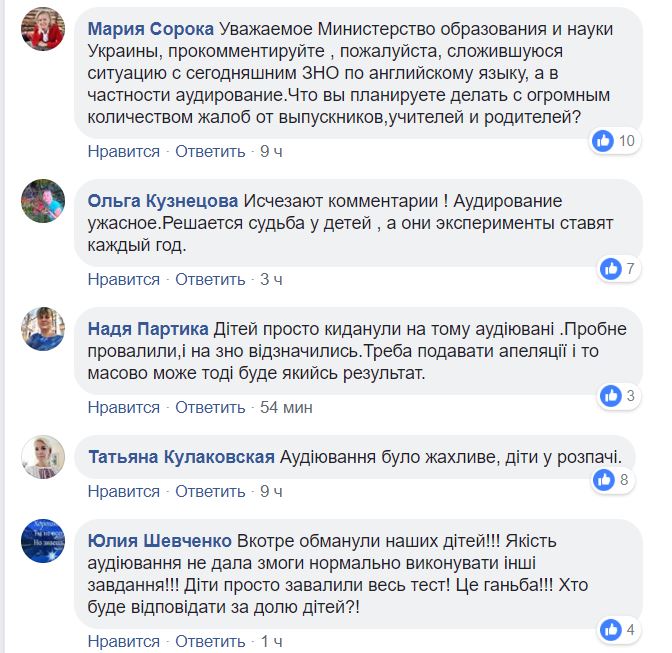 Пользовательница Мария Сорока пишет: "Уважаемое Министерство образования и науки Украины, прокомментируйте , пожалуйста, сложившуюся ситуацию с сегодняшним ЗНО по английскому языку, а в частности аудирование.Что вы планируете делать с огромным количеством жалоб от выпускников,учителей и родителей?".