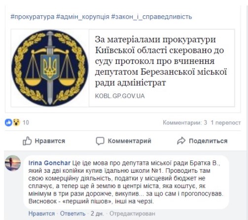 Депутат тієї ж таки Березанської міської ради Володимир Братко, який представляє партію "Солідарність", під час чергової сесії в умовах реального конфлікту інтересів, з метою поліпшення свого матеріального становища, проголосував за продаж земельної ділянки підприємству, яке йому і належить. Крім того, його голос виявися вирішальним для прийняття рішення.