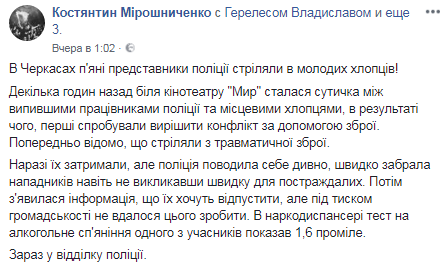"Произошло столкновение между выпившими сотрудниками полиции и местными ребятами, в результате чего первые попытались решить конфликт с помощью оружия. Предварительно известно, что стреляли из травматического оружия. Сейчас их задержали, но полиция вела себя странно: быстро забрала нападающих, даже не вызвав скорую для пострадавших. Затем появилась информация, что их хотят отпустить, но под давлением общественности не удалось этого сделать. В наркодиспансере тест на алкогольное опьянение одного из участников показал 1,6 промилле", – пишет Мирошниченко.