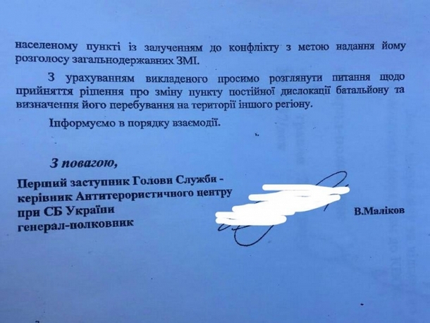 "З урахуванням вищевикладеного просимо розглянути питання зміни пункту постійної дислокації батальйону і визначення його перебування на території іншого регіону", - написав Маліков.