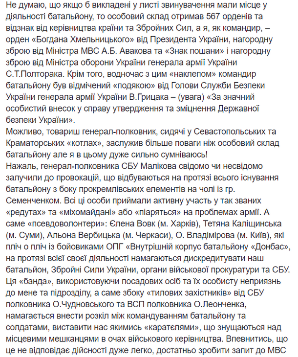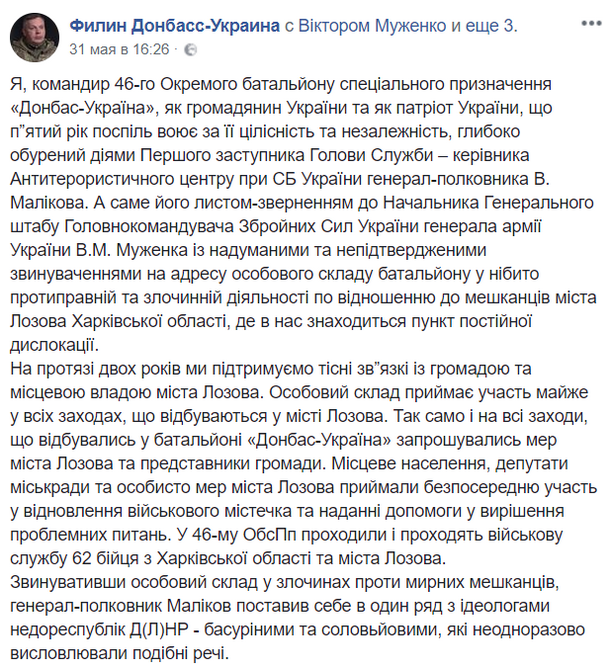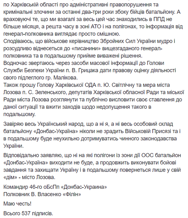 "Звинувативши особовий склад в злочинах проти мирних жителів, генерал-полковник Маліков поставив себе в один ряд з ідеологами недореспублік ЛДНР - Басуріним і Соловйовим, які неодноразово декламували подібні речі, - відповів на звинувачення "Філін". - Переконатися, що це не відповідає дійсності дуже легко, досить зробити запит в МВС по Харківській області про адміністративні правопорушення та кримінальні злочини за останні два-три роки з боку бійців батальйону. А з огляду на те, що ми взагалі за весь цей час перебували в ППД не більше місяця, а решту часу в зоні АТО і на полігонах, то інформація від генерал-полковника виглядає просто смішною".