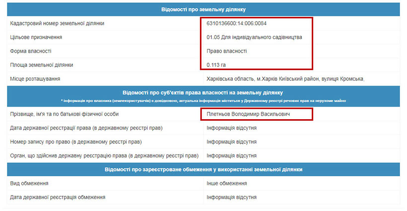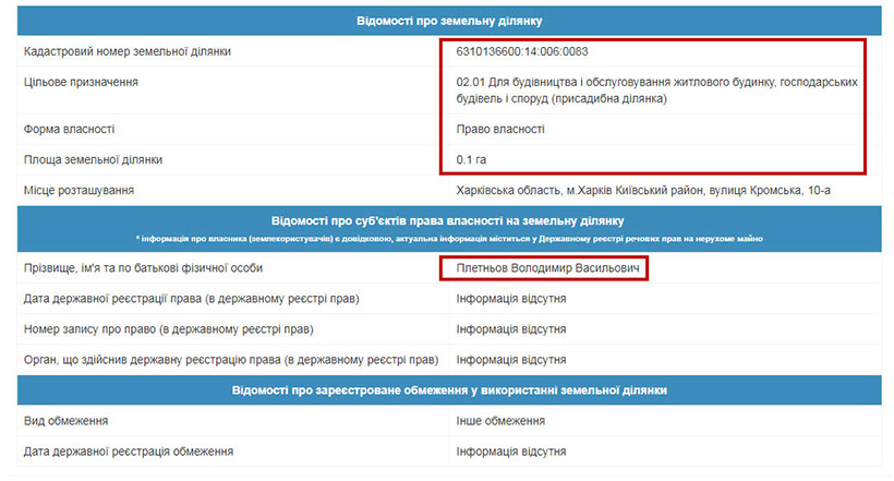 Щодо Володимира Плетньова, то він має будинок у Харкові на 328 кв. м., набутий у власність у 2012 році за 1 099 872 грн. Він розміщений на двох земельних ділянках, які теж не відображені у деклараціях. Наразі навколо будинку ведеться будівництво.