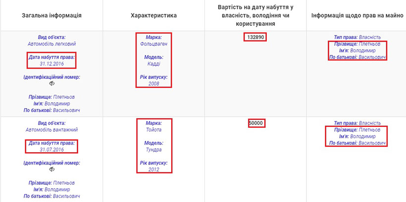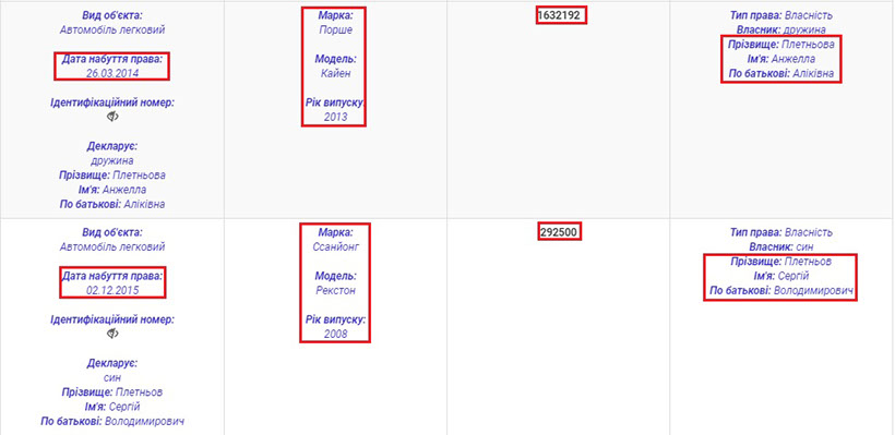 У розпорядженні сім’ї Плетньових автопарк з п’ятьох автомобілів. Суддя користується Volkswagen Caddy, придбаним у 2016 році за 132 890 грн та Toyota Tundra вартістю 50 000 грн, що навряд чи відповідає дійсності. У 2014 дружина придбала PORSCHE Cayenne за 1 632 192 грн. Син Сергій пересувається на SsangYong Rexton придбаному за 292 500 грн. Донька Юлія торік купила Audi Q7. Ринкова ціна такої автівки близько 2 мільйонів гривень.