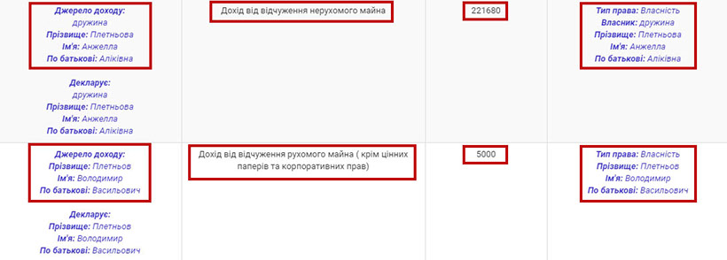 У декларації за 2016 рік вказано, що Анжела Аліківна отримала дохід від відчуження нерухомого майна 221 680 грн, однак джерелом цих коштів зазначається вона сама. Тобто задокументовано так, ніби дружина щось продала сама собі. Ідентично заповнена колонка і у судді Володимира Плетньова. Ймовірно, суддя ставиться до декларування невідповідально.
