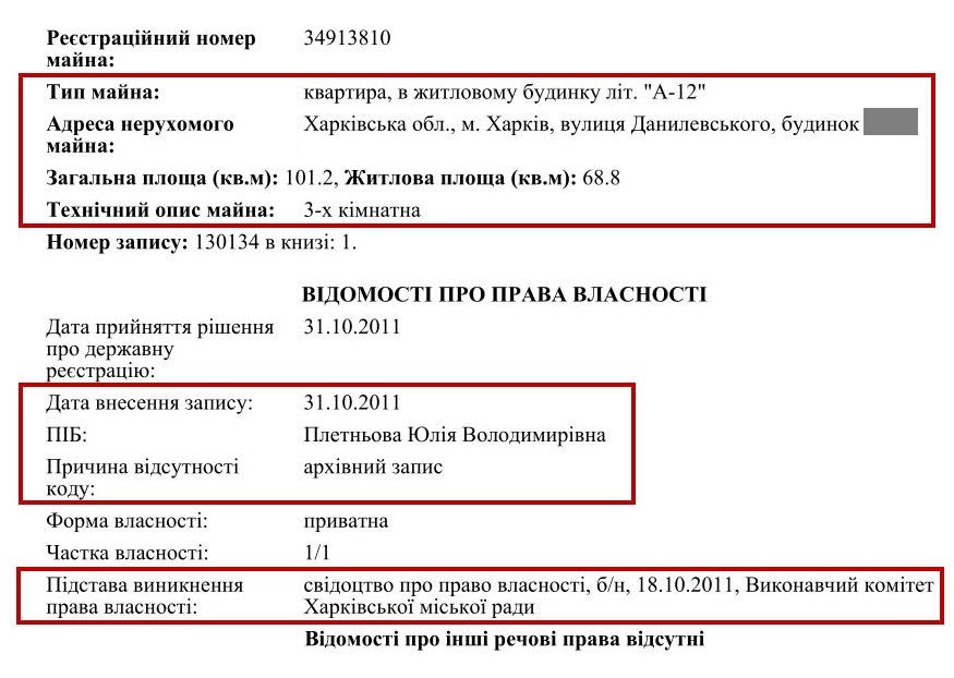 З дочок найцікавішою є Юлія Плетньова. Якщо подивитись декларацію судді за 2015 рік (у т.ч. уточнену), то у Юлії Володимирівни взагалі немає ні майна, ні доходів. Але насправді це не зовсім так. На неї зареєстрована квартира на 101 кв. м. в елітному районі Харкова ще з 2011 року. У цьому ж будинку вона має гараж. За даними ГО «Харківський антикорупційний центр», вартість квадратного метру у цьому житловому комплексі коштує 3000 доларів.