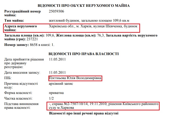 Окрім того, у Юлії Володимирівни у 2015 році була у власності нежитлова будівля площею 1 030 кв. м., яка знаходиться у с. Циркуни, Харківської області та ½ будинку площею 109 кв. м. у Харкові, на вул. Шевченка. Право власності на будинок визнано рішенням суду ще у 2010 році.