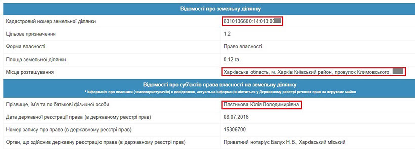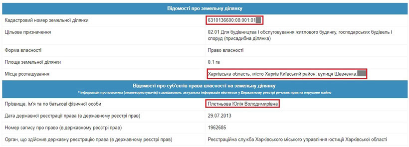А ще пані Юлія є власником 4 земельних ділянок з кадастровими номерами: 6322081003:00:000:00__, 6310136600:08:001:01__, 6310136600:14:013:00__, 6310136600:14:013:00__. Тобто суддя приховав від декларування доволі великий перелік майна, який належить його дочці.