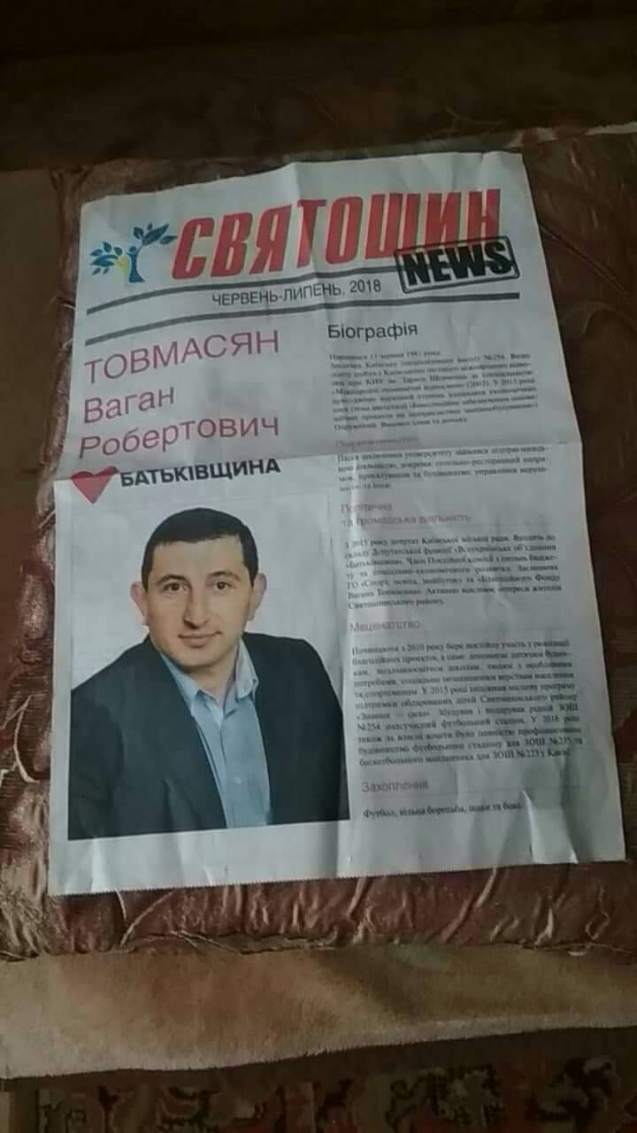 Продуктовые наборы раздаются в пакетах с политической рекламой партии “Батькивщина” и лично депутата Вагана Товмасяна (фракция ВО “Батькивщина”), а также газетой “Святошин News” с заголовками вроде “Ваган Товмасян: Только реальные дела”. В состав набора входит рис, мука, макароны, крупы, масло, сахар и чай.