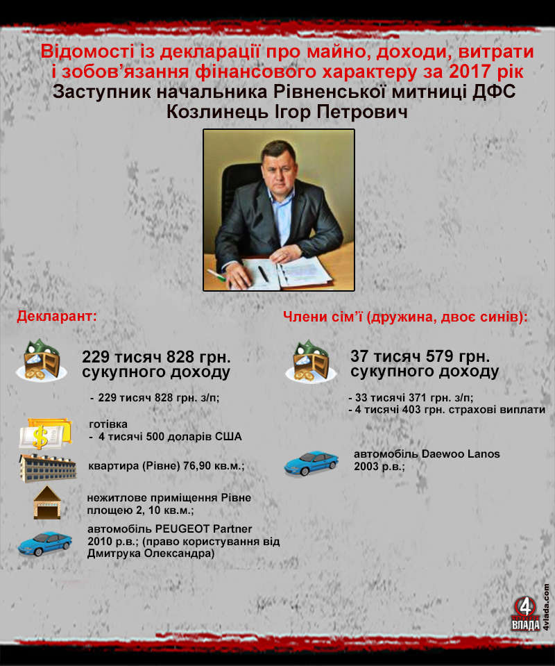 Заместитель начальника таможни Игорь Козлинец. Он имеет квартиру в Киеве площадью 76,90 кв.м. В собственности автомобиль не имеет, пользуется Peugeot Partner, 2010 г. в.