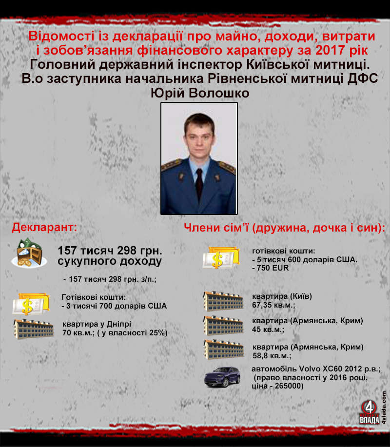 За 2017 год в должности главного инспектора Киевской таможни он заработал 157 тыс 298 гривен. В его собственности также четверть квартиры в Днепре площадью 70 кв.м. Наличными у таможенника 3700 долларов.