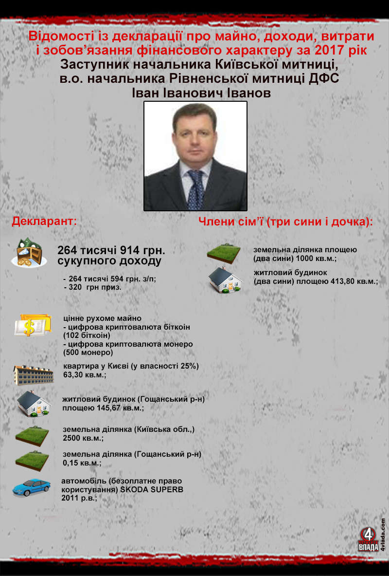 Теги: Иванов ИванВолошко ЮрийСимчук ВиталийКозлинец ИгорьИмуществоЕ-декларацииРовенская таможняТаможняГФСПрокопец Владимир