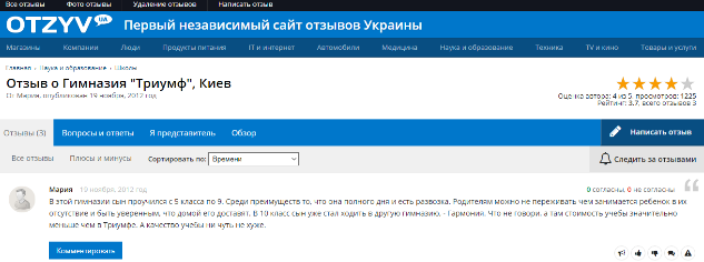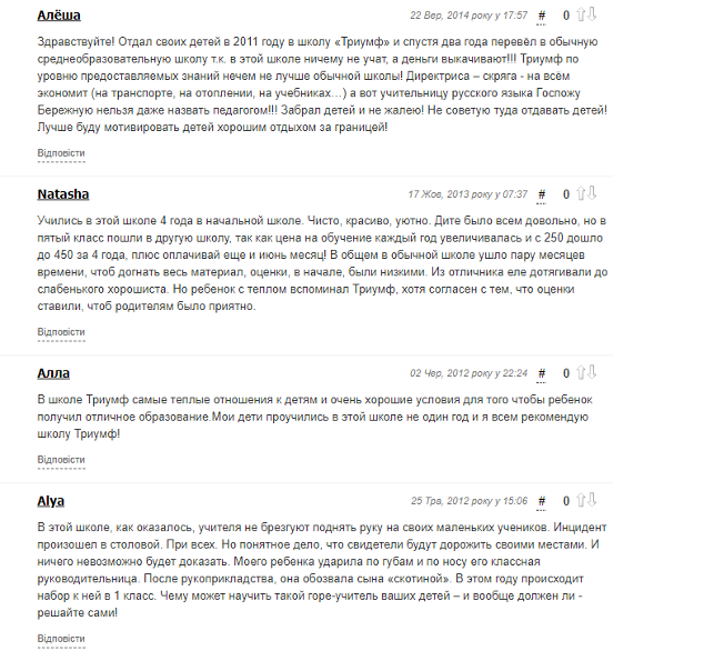Цікаво, чим саме тоді приватна школа «Тріумф» так приваблює дорослих? Доглянутими, охайними приміщеннями? Державні заклади освіти мало чим поступаються у цьому. Обіцянками, що тут дитині буде комфортно і вона буде всебічно розвиватися та отримувати знання?Але ж батьки стверджують протилежне: «Оцінки ставлять аби батькам так би мовити було «приємно». Вартість навчання необгрунтовано висока: «Насчет очень низкого уровня знаний при переходе в обычную школу - это абсолютная правда. Раньше даже и не подумала бы об этом, если бы на себе не проверили. Насчет стоимости, она намного выше. чем в самом престижном ВУЗе Украины. Делайте выводы».
