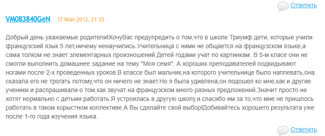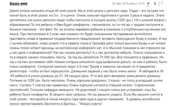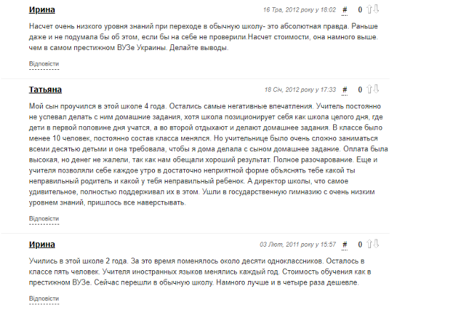 Коментар ще однієї матусі: «Учились в этой школе 2 года. За это время поменялось около десяти одноклассников. Осталось в классе пять человек. Учителя иностранных языков менялись каждый год. Стоимость обучения как в престижном ВУЗе. Сейчас перешли в обычную школу. Намного лучше и в четыре раза дешевле».