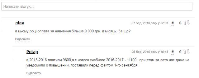 Вашій увазі непомірні апетити сучасного, продвинутого та досвідченого педагога – директора спеціалізованої школи «Тріумф» Мовчун Олени Миколаївни: уявіть, у коментарях ще від 2015 року батьки обурюються, що керівництво школи «Тріумф» загнули вартість 9,000 грн. за навчання! З 2016-2017 вже платили 11,100, при цьому впродовж літнього періоду батьків навіть не повідомили про підвищення, поставили перед фактом вже 1-го вересня!