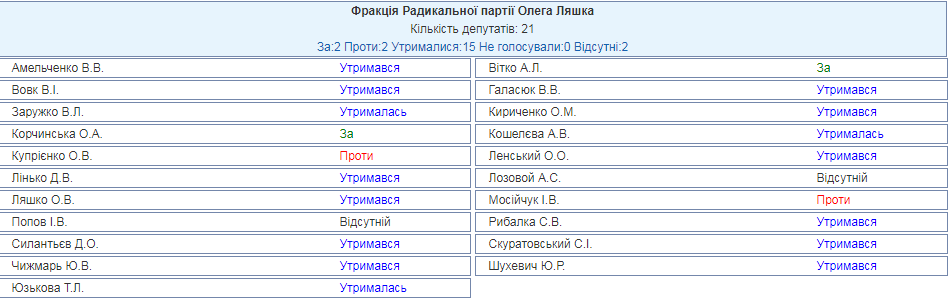 Из фракции «Радикальной партии», в которую входит 21 депутат, проголосовала «за» только депутат Оксана Корчинская.