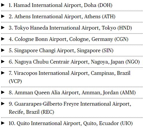 При этом лучшими признаны международные аэропорты «Хамад» (Доха, Катар), «Афины» (Афины, Греция), «Ханеда» (Токио, Япония), «Кельн-Бонн» (Кельн, Германия) и «Чанги» (Сингапур).