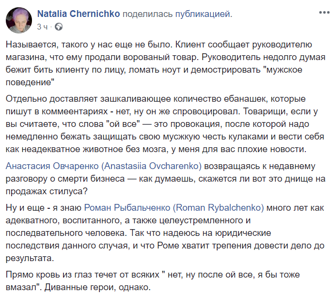 "Товарищи, если у вы считаете, что слова "ой все" — это провокация, после которой надо немедленно бежать защищать свою мусжкую честь кулаками и вести себя как неадекватное животное без мозга, у меня для вас плохие новости. ... Прямо кровь из глаз течет от всяких " нет, ну после ой все, я бы тоже вмазал". Диванные герои, однако", - пишет киевлянка Наталья Черничко, которая заявляет, что знает Рыбальченко много лет.