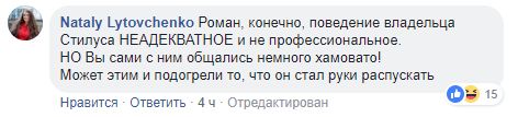 Пишут о том, что пострадавший спровоцировал нападавшего хамством: "Роман, конечно, поведение владельца Стилуса неадекватное и непрофессиональное. Но вы сами с ним общались немного хамовато! Может этим и подогрели то, что он стал руки распускать".