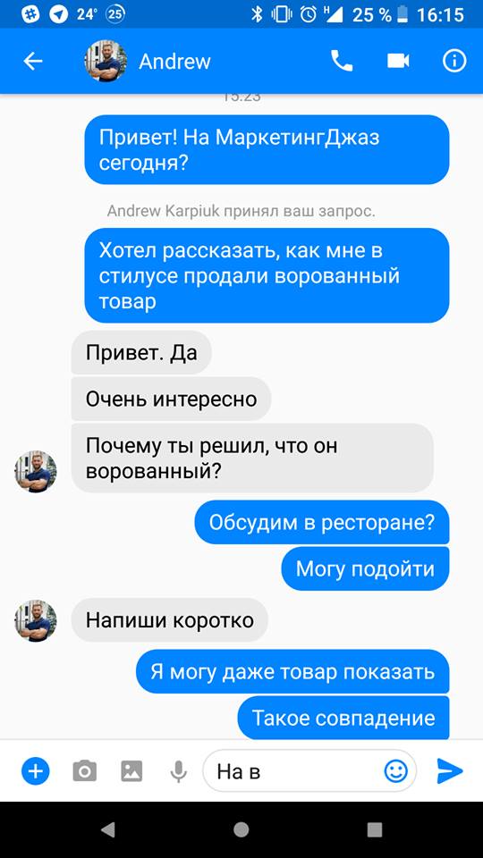 Несмотря на это, Рыбальченко решил по какой-то причине обратиться и к самому Андрею Карпюку, которого специально разыскал через знакомых в Одессе на конференции The MarketingJazzz Fest. И оттуда написал ему сообщение в Facebook, предложив встретиться здесь же, на мероприятии.