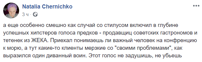 Она также пишет, что "случай со Стилусом включил в глубине успешных хипстеров голоса предков - продавщиц советских гастрономов и тетенек из ЖЕКА. Приехал понимаешь ли важный человек на конфренцию к морю, а тут какие-то клиенты мерзкие со "своими проблемами", как выразился один диванный воин. Этот голос не задушишь, не убьешь".