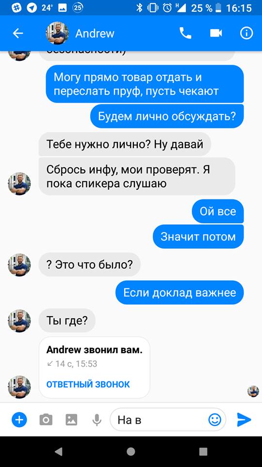 Из нижеследующего скриншота видно, что Рыбальченко, который уже, как говорилось выше, решил вопрос по гаджету, требует личной встречи с Карпюком и хочет отдать Kindle ему лично в руки. Тот в ответ пообещал проверить, в чем проблема и согласился встретиться лично, но не сию минуту - на конференции как раз шел доклад.