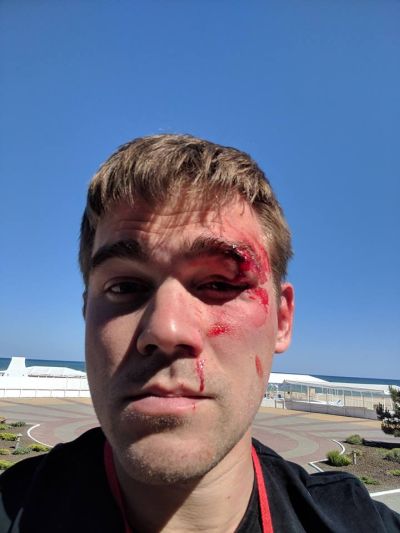 И тут Андрей на меня накидывается. Начинает ударять мой ноутбук об стол и пол, подскакивает ко мне и начинает наносить методичные удары кулаком мне в бровь".