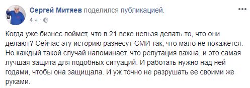 Журналист Сергей Митяев возмущен случившимся: "Когда уже бизнес поймет, что в 21 веке нельзя делать то, что они делают? Сейчас эту историю разнесут СМИ так, что мало не покажется. Но каждый такой случай напоминает, что репутация важна, и это самая лучшая защита для подобных ситуаций. И работать нужно над ней годами, чтобы она защищала. И уж точно не разрушать ее своими же руками".