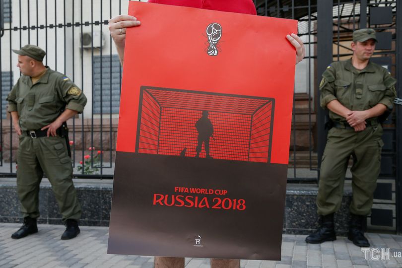 У четвер, 14 червня, біля посольства Російської Федерації в Києві пройшла акція з вимогою бойкотувати Чемпіонат світу-2018 з футболу, який проходить в Росії.