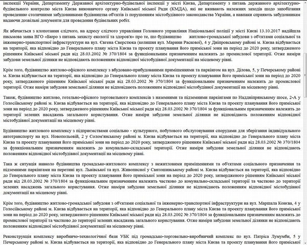 Отделом расследования преступлений в сфере хозяйственной и служебной деятельности СУ ГУ Национальной полиции в городе Киеве осуществляется досудебное расследование в уголовном производстве № 12017100000001093 от 18.10.2017 по факту злоупотребления властью и служебным положением должностными лицами контролирующих органов в сфере градостроительной деятельности. Действия чиновников имеют все признаки уголовного преступления, предусмотренного ч. 2 ст. 364 УК Украины – Злоупотребление властью или служебным положением.