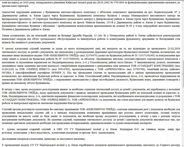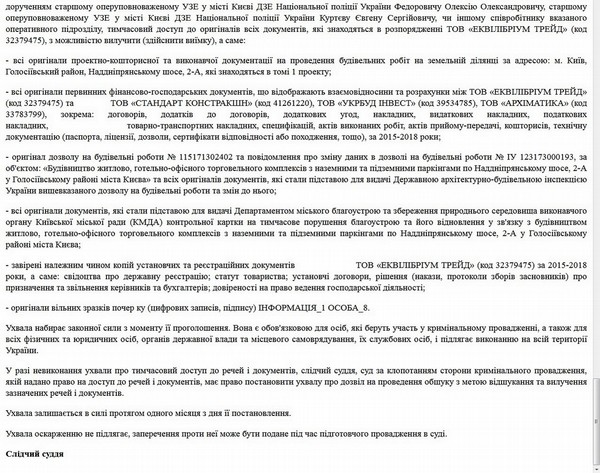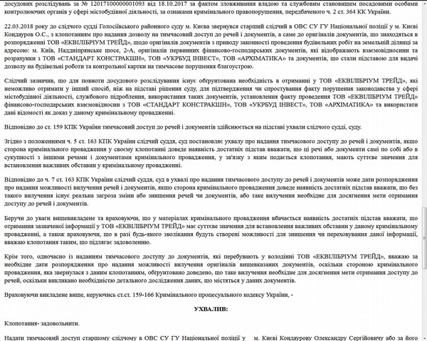 Старший следователь по ОВД СУ ГУ Национальной полиции в г. Киеве обратился в суд с ходатайством о предоставлении разрешения на временный доступ к вещам и документам, а именно к оригиналам документов, находящихся в распоряжении ООО «ЭКВИЛИБРИУМ ТРЕЙД». Следствие интересуют оригиналы документов, по которым можно определить законность проведения строительных работ на земельном участке по адресу: г. Киев, Надднепрянское шоссе, 2-А. А также оригиналы первичных финансово-хозяйственных документов, отражающих взаимоотношения и расчеты с ООО «СТАНДАРТ КОНСТРАКШН» (код 41261220), ООО «УКРБУД ИНВЕСТ» (код 39534785), ООО «АРХИМАТИКА» (код 33783799) и документов, послуживших основанием для выдачи разрешения на строительные работы и контрольной карточки на временное нарушение благоустройства.