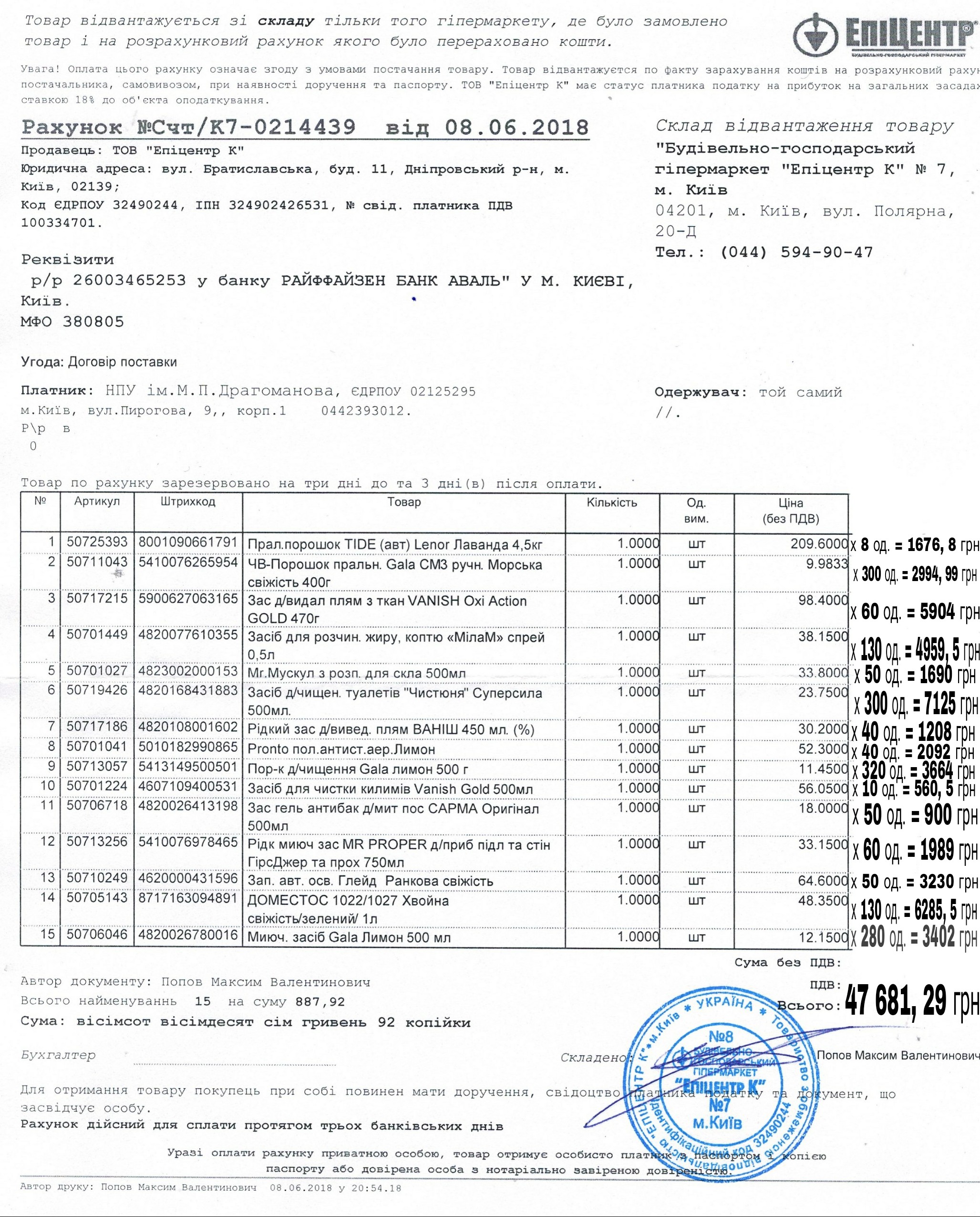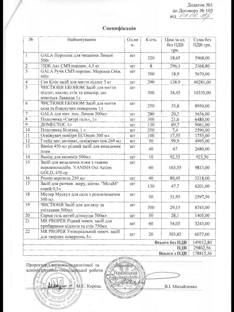 Загальна сума без урахування ПДВ складає 47 681.29 гривень. Університет закупив ці самі побутові засоби за 72 544.8 гривень (без ПДВ) (додаток 9, 10).