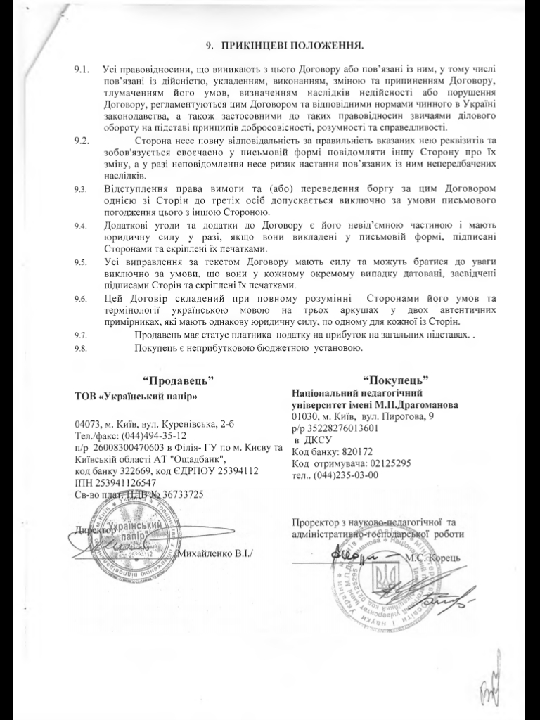 Згідно з системою електронних закупівель «ProZorro» НПУ ім. М. П. Драгоманова 04 червня 2018 уклало договір №105 (ідентифікатор договору в системі «ProZorro» — UA-2018-06-04-001235-b-c1) на закупівлю продукції для чищення з ТОВ «Український папір» на суму 178 815,36 гривень. Термін дії договору передбачений з 04 червня 2018 по 31 грудня 2018 року (додатки 1,2,3,4).