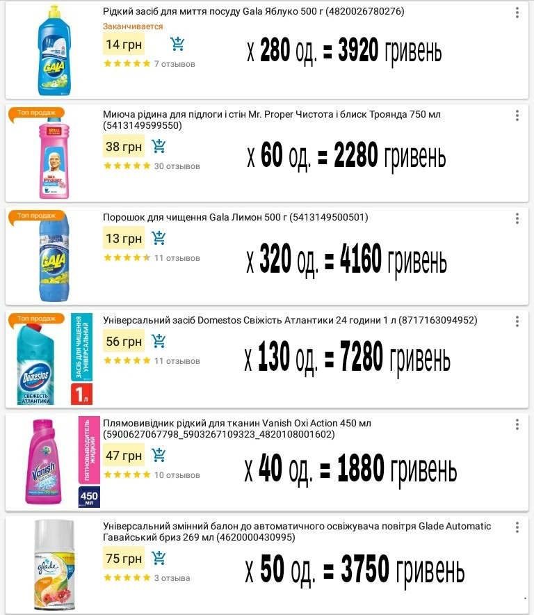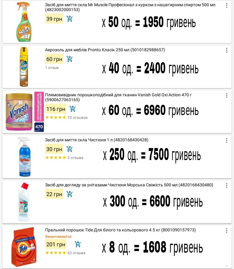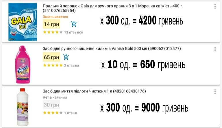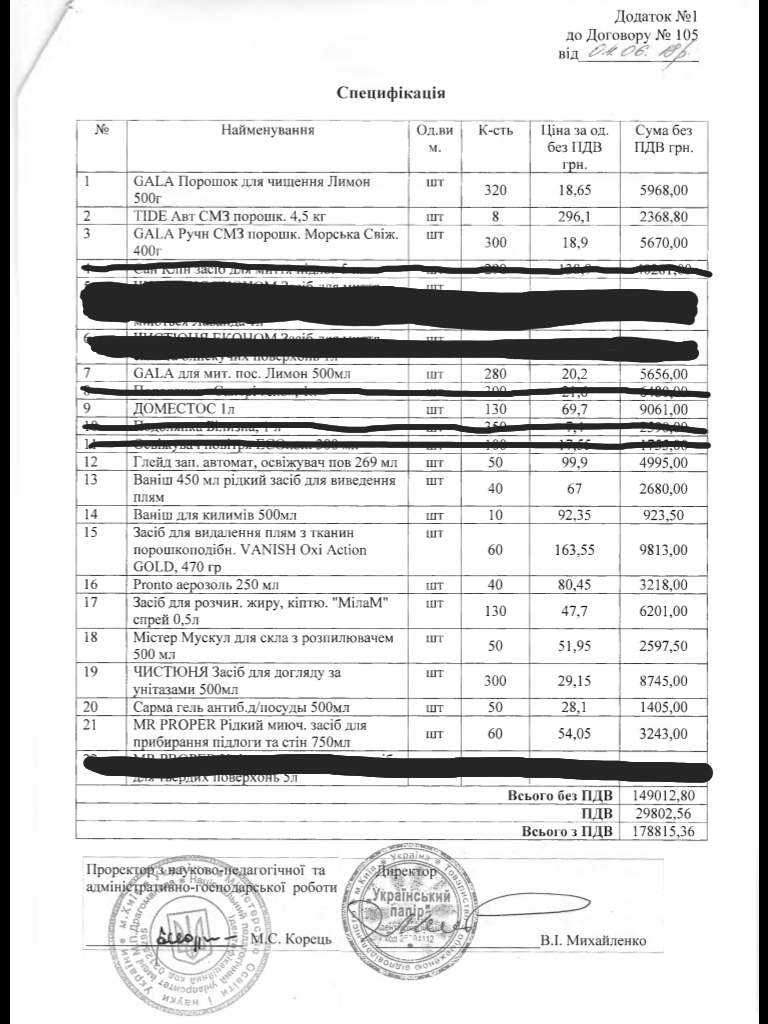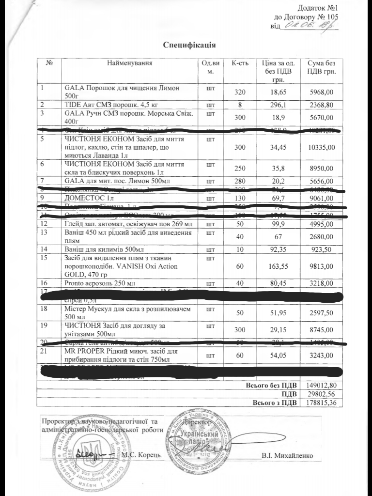 Якщо взяти таку ж кількість товарів, що вказані в договорі, в магазині «Розетка», загальна сума буде 64 138 гривень. За договором ці 15 видів миючих засобів університет закупив за 84 222.80 гривень (без урахування ПДВ) (додаток 8).
