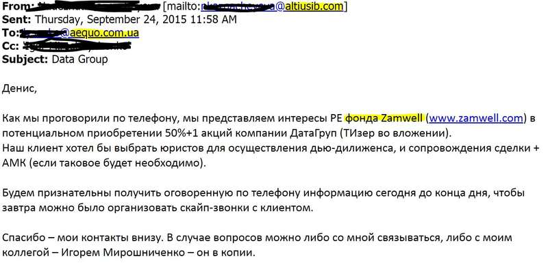 В цілому: фонд Zamwel через посередника в Україні ALTIUSIB, звертається до компанії Анни Бабич з проханням вирішити всі юридичні питання продажу української «Датагруп» з рук ICU (де голова Макар Пасенюк) до самого фонду Zamwel. Так як йдеться про 50%+1 акцій, то без участі Антимонопольного комітету не обійдеться. Як ніяк 2015 надворі. Другий рік війни. І буде чимало запитань, чому росіяни конкретно вохрять на український телекомунікаційний ринок.