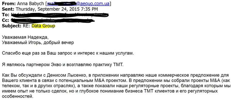 Питання Дата-Груп для російського фонду в ЕКВО береться вирішувати якраз Анна Бабич. Того ж дня вона представляє комерційну пропозицію росіянам і одразу заспокоює, що команда ЕКВО має системний досвід роботи з АМКУ, в тому числі з питань комплексних угод, які можуть мати ознаки монопольного становища або пов’язані з цим.