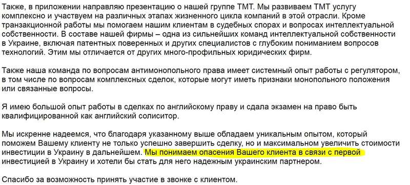 Мы искренне надеемся, что благодаря указанному выше обладаем уникальным опытом, который поможем Вашему клиенту не только успешно завершить сделку, но и максимальном увеличить стоимости инвестиции в Украину в дальнейшем. Мы понимаем опасения Вашего клиента в связи с первой инвестицией в Украину и хотели бы стать для него надежным украинским партнером.