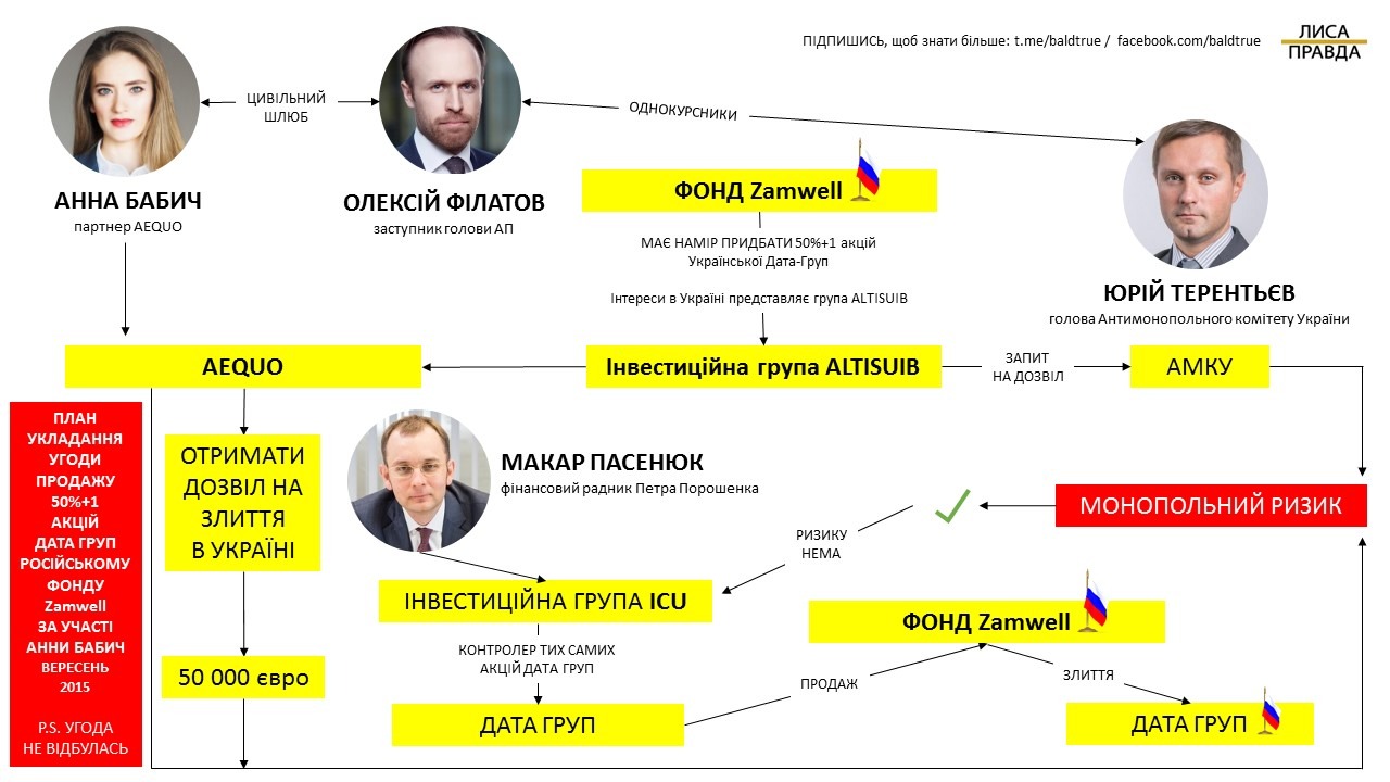 А в 2015 році Анна Бабич брала участь в перемовинах продажу російській інвестиційній групі Zamwell української «Дата-груп». Для розуміння: нижче представлена схема лише Волоконно-оптична мережі