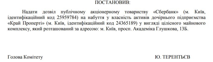 20.02.2018 АМКУ схвалив придбання українською «дочкою» «Сбербанку» двох готелів в Одесі у ВАТ «Туристично-виробнича фірма «Чорне море» Леоніда Клімова.30.11.2017 АМКУ надав дозвіл ПАТ «Сбербанк» (м. Київ) на одержання в управління активів у вигляді цілісного майнового комплексу ТОВ «Маріупольський Млинкомбінат» (Донецька обл.).