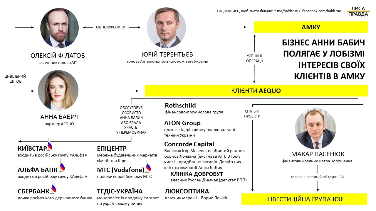 А із 2015 року Антимонопольний комітет очолює однокурсник Філатова Юрій Терентьєв. Але про все за порядком: Як саме працює Анна Бабич та її компанія? Хто її клієнти? І як їй у цьому допомагають цивільний чоловік та його однокурсник?