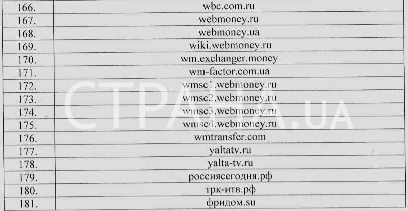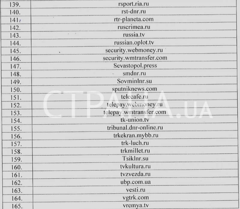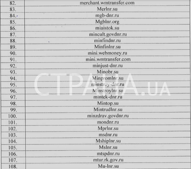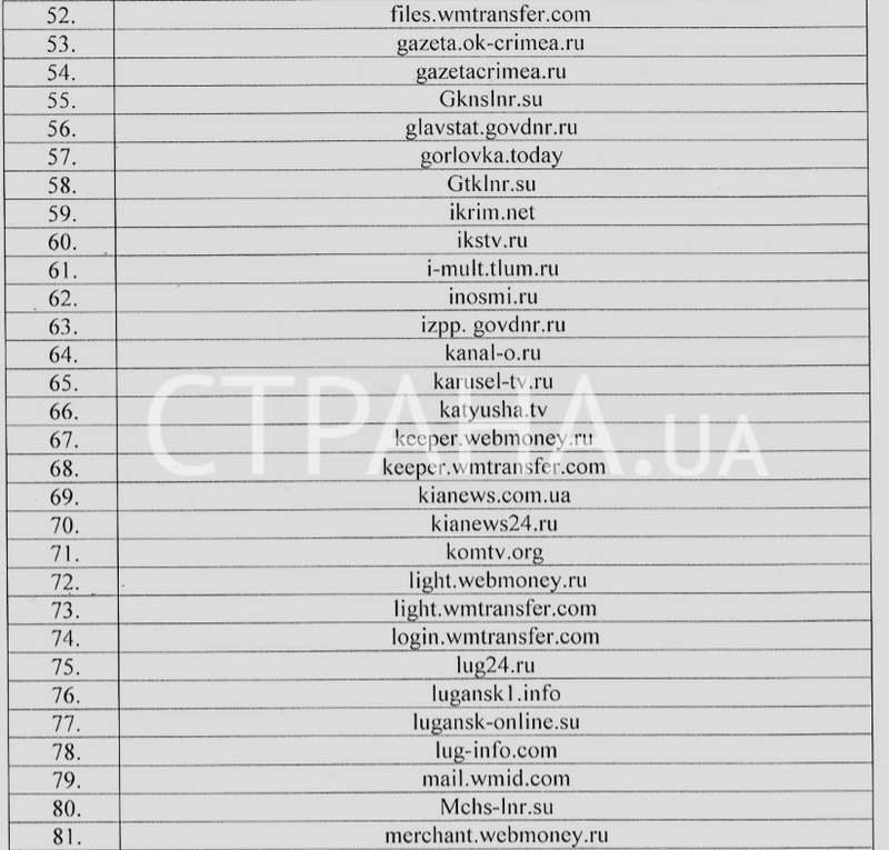 В документе присутствуют сайты «ДНР» и «ЛНР», официальные веб-странички крымских властей, многие российские информационные агентства, а также все поддомены платежного сервиса Webmoney.