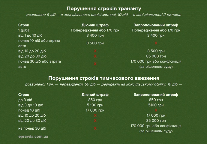 За один день прострочення вивезення транзитного авто з порушника буде стягнуто 170 грн, а за три дні відтермінування вивезення тимчасово ввезеної машини — 850 грн.