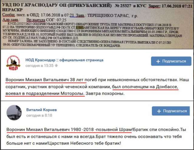 В России на берегу реки Кубань вчера было обнаружено тело российского наемника Воронина Михаила Витальевича, известного по позывному «Шрам», принимавшего участие в боевых действиях в Чечне и Донбассе.