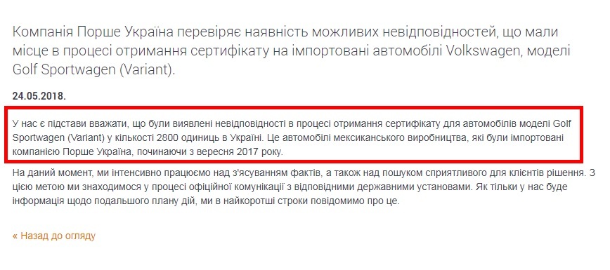 В пресс-службе Главного сервисного центра МВД в ответ на запрос AUTO-Consulting ответили, что в сертификатах соответствия на эти автомобили были обнаружены неточности, из-за которых они являются недействительными. В свою очередь, руководитель Главного сервисного центра МВД Владислав Криклий сообщил, что на основании этих фактов последует аннулирование регистрации всей партии автомобилей Volkswagen Golf Sportwagen и последующий запрет наэксплуатацию. Произойдет это уже в самое ближайшее время. Ситуация зашла так далеко, что импортер был вынужден официально признать проблему.