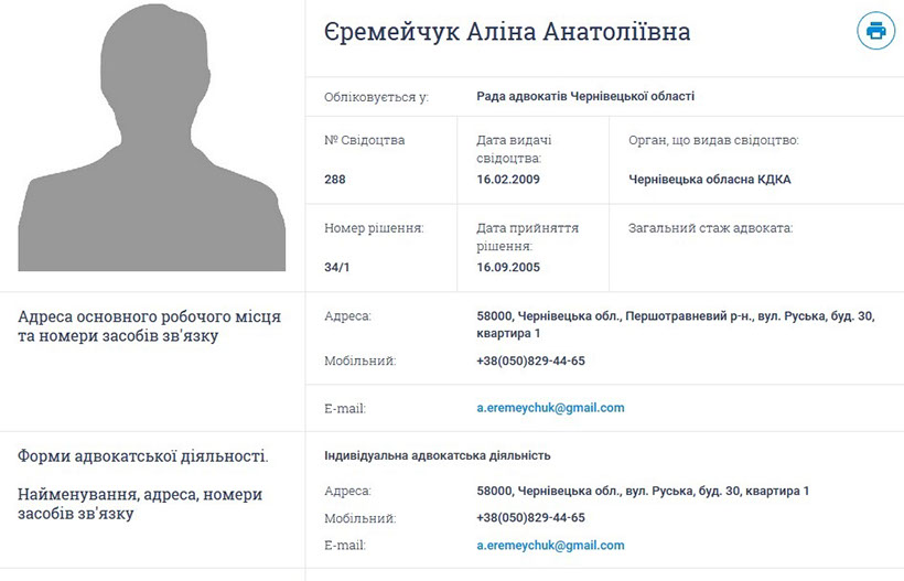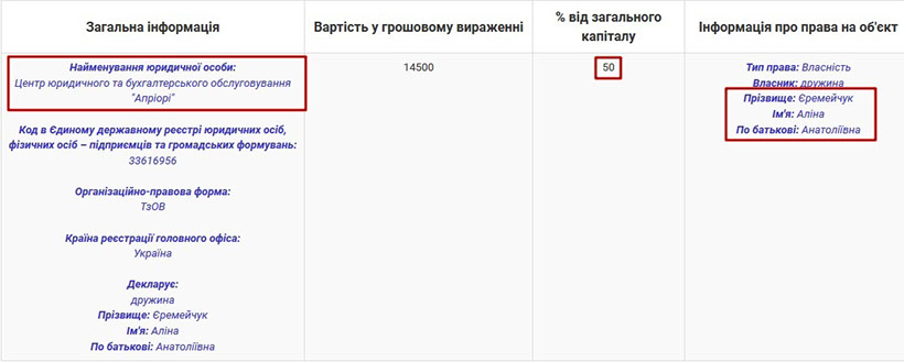 В декларации Алина Еремейчук указала, что является соучредителем компании «Априори». Также нам удалось выяснить, что Алина Анатольевна зарегистрирована как адвокат.
