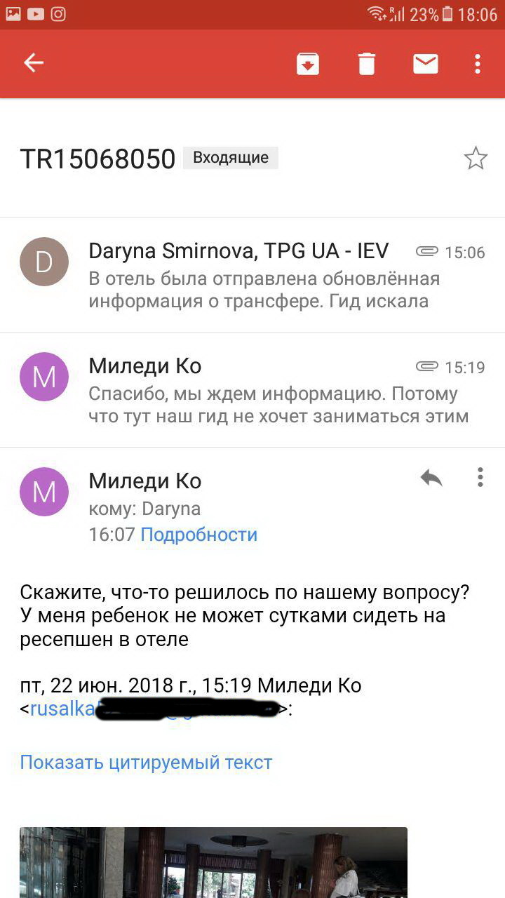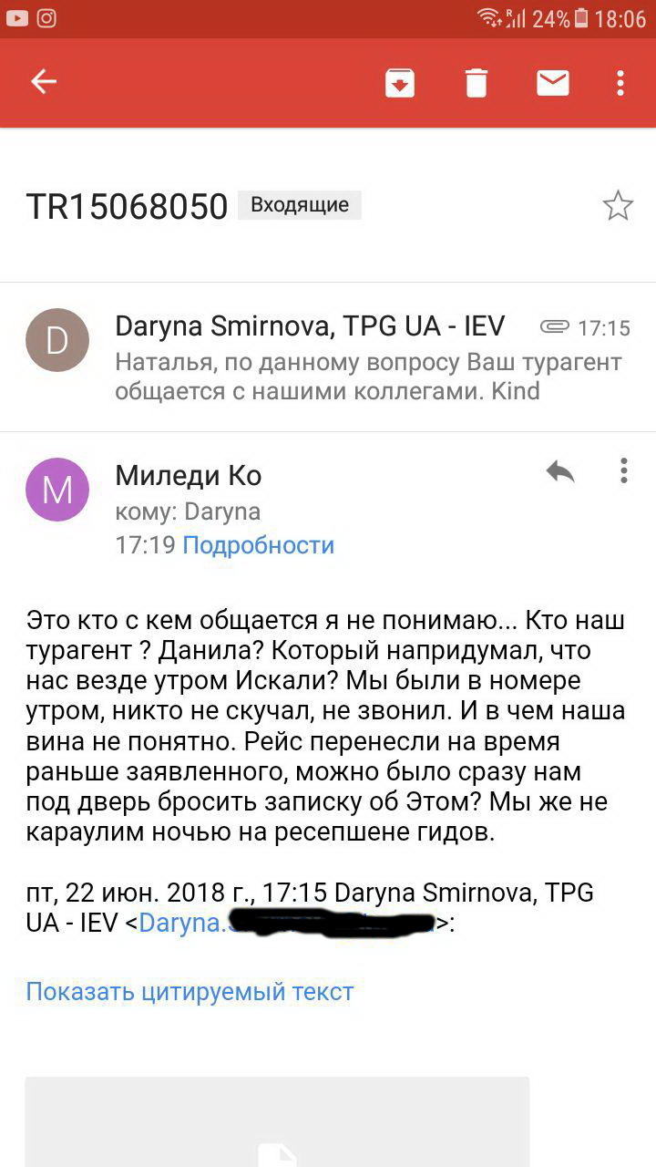 "Наш оператор TPG поздно вечером 21 июня накануне дня вылета (22 июня) поменял расписание на более раннее, чем было заявлено, и не предупредил нас. Когда самолет улетел рано утром в пятницу, нам стали рассказывать, что искали нас и не смогли найти", - рассказал OBOZREVATEL киевлянин Роман Ковальский.