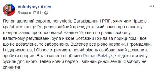 Возмущение Власенко было вызвано постом Арьева о принятии закона о валютной либерализации.