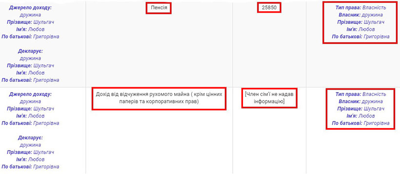 За 2017 год он задекларировал лишь судейскую зарплату и пенсию. Жена, Шульгач Любовь Григорьевна, кроме собственной пенсии, имела дополнительный доход от продажи имущества. Однако, судя по документу, муж об этой ситуации не осведомлен. В предыдущие годы судья не указывал ни сбережений, ни каких-либо ее доходов, кроме пенсии.