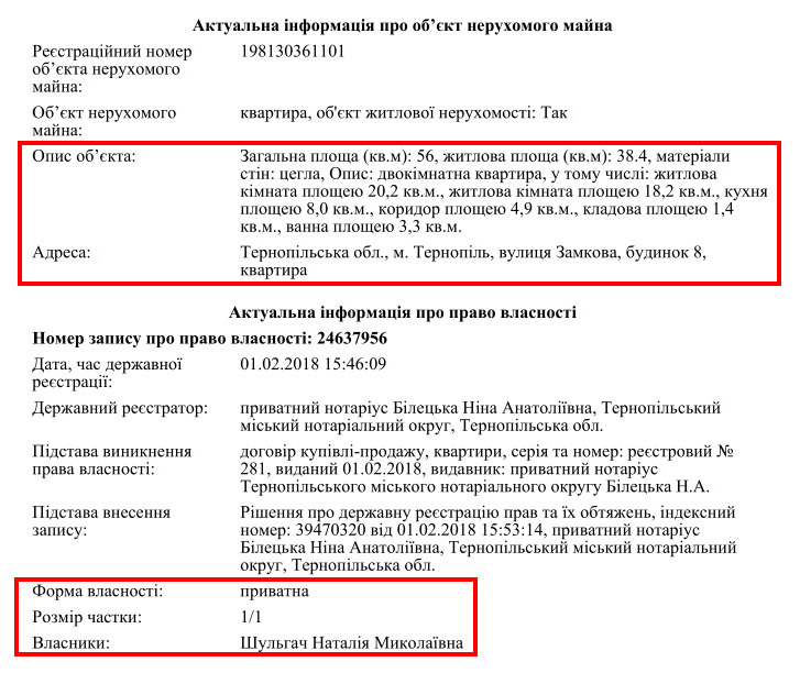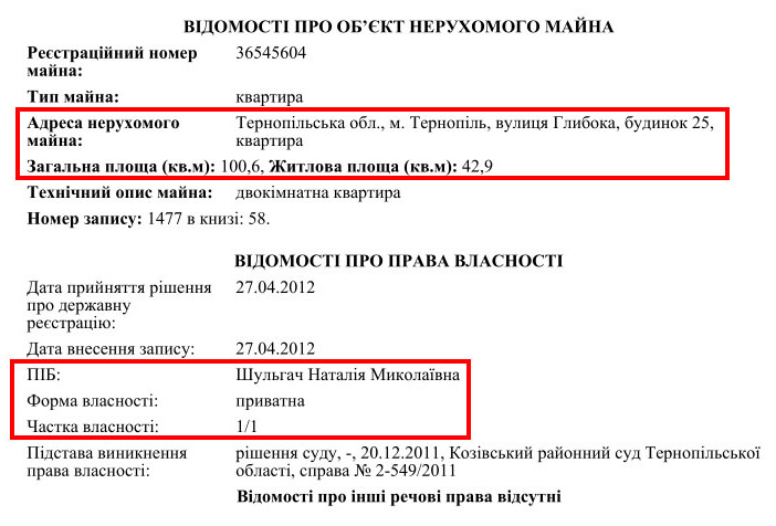 Впрочем, отдельного внимания требует недвижимое имущество дочери судьи Шульгач Натальи Николаевны. С момента окончания университета она работает секретарем судебных заседаний, то есть на государственной службе. За год до своей свадьбы девушка купила большую квартиру в Тернополе на 100 кв. м.