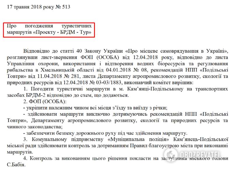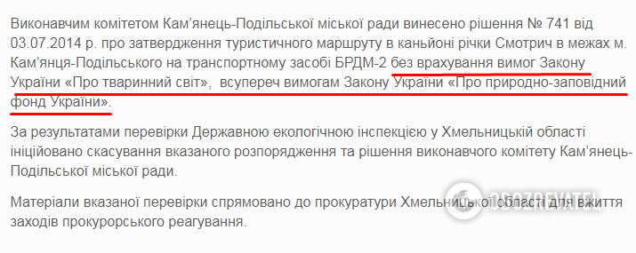 Еще в 2014 году исполнительный комитет Каменец-Подольского горсовета внес решение про утверждение в каньоне р. Смотрич туристического маршрута на БРДМ-2, что по выводам работников инспекции, произошло без учета требований Закона Украины "О животном мире" и вопреки требованиям ЗУ "О природно-заповедном фонде Украины", - говорится на официальном сайте экологической инспекции.